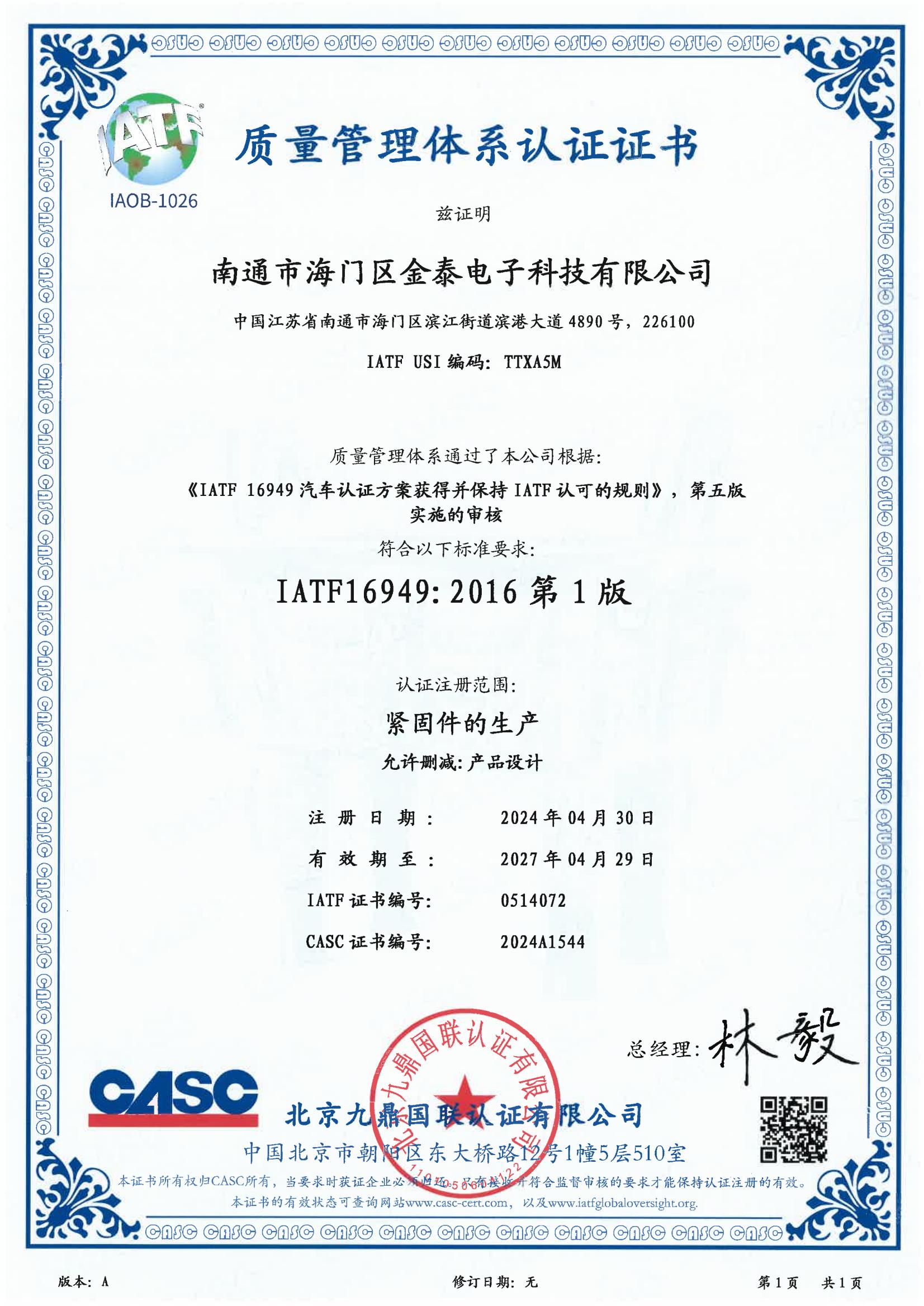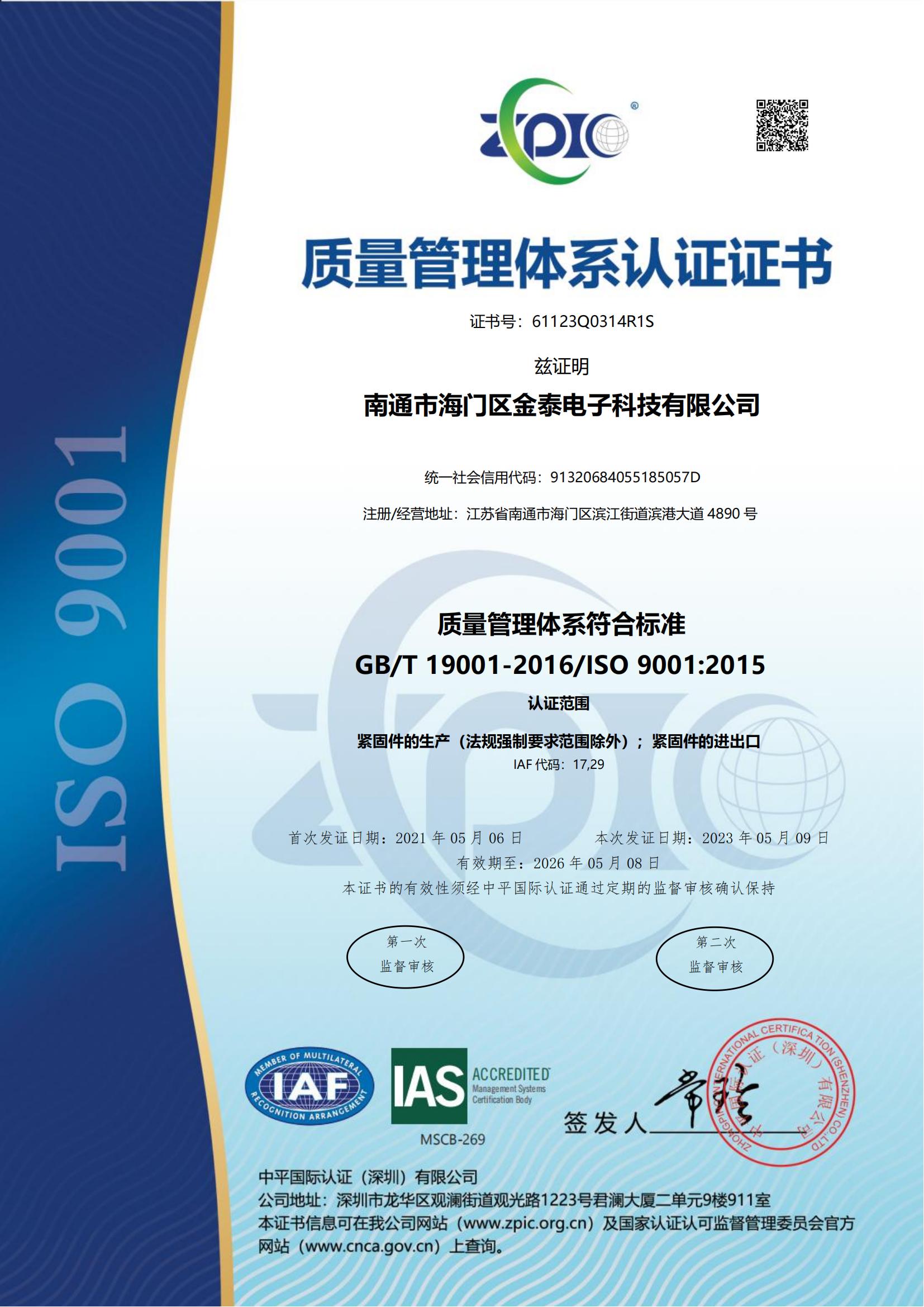 金泰緊固件獲得專(zhuān)業(yè)認(rèn)證